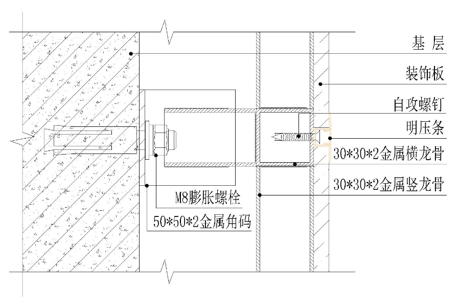 采用熱鍍鋅角碼同錨栓作為支點(diǎn),鍍鋅鋼作為連接件,30x30x2為豎龍骨,30x30x2為橫龍骨,隧道板通過(guò)自攻釘同橫豎龍骨及明壓條進(jìn)行連接的施工工藝。