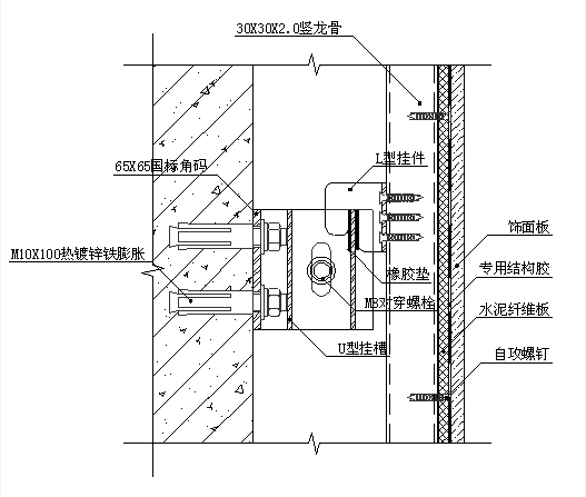 固定金屬角碼:分格設(shè)計(jì)圖彈線(xiàn)放樣,確定點(diǎn)位后用沖擊鉆鉆孔,通過(guò)膨脹螺栓將金屬角碼和基層墻體連接并固定,然后通過(guò)角碼固定“U”型掛件。