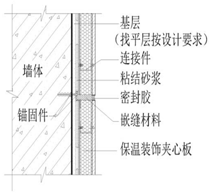 系統(tǒng)由保溫裝飾夾心板、粘結(jié)砂漿、錨固件、嵌縫材料和密封膠等材料構(gòu)成,采用粘結(jié)砂漿粘結(jié)、錨固件機械連接錨固組合的施工工藝將保溫裝飾夾心板安裝在建筑外墻外表面的非承重保溫裝飾構(gòu)造總稱。