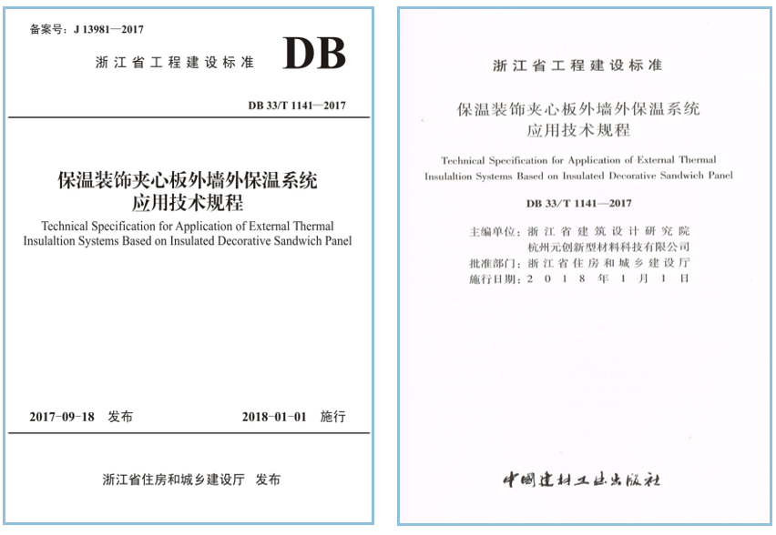 于2017年浙江省建筑設(shè)計研究院、杭州元創(chuàng)新型材料科技有限公司共同主編浙江省省標(biāo)《保溫裝飾夾心板外墻外保溫系統(tǒng)應(yīng)用技術(shù)規(guī)程》DB 33/T 1141-2017,于2018年1月1日正式實施。